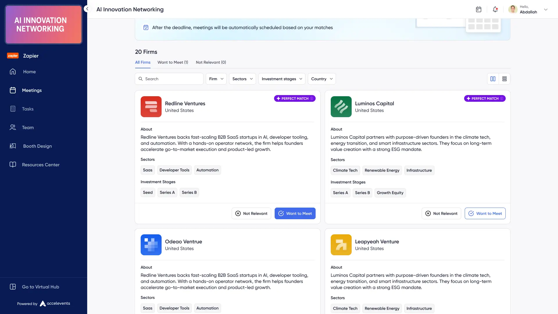 - After the registration period has closed, Accelevents guides participants through a selection process where they define who they’d like to meet. Event Organizers can create multiple selection processes that open and close at different times, to make sure that sellers get to select from a list of the buyers most likely to be interested in their product or service.