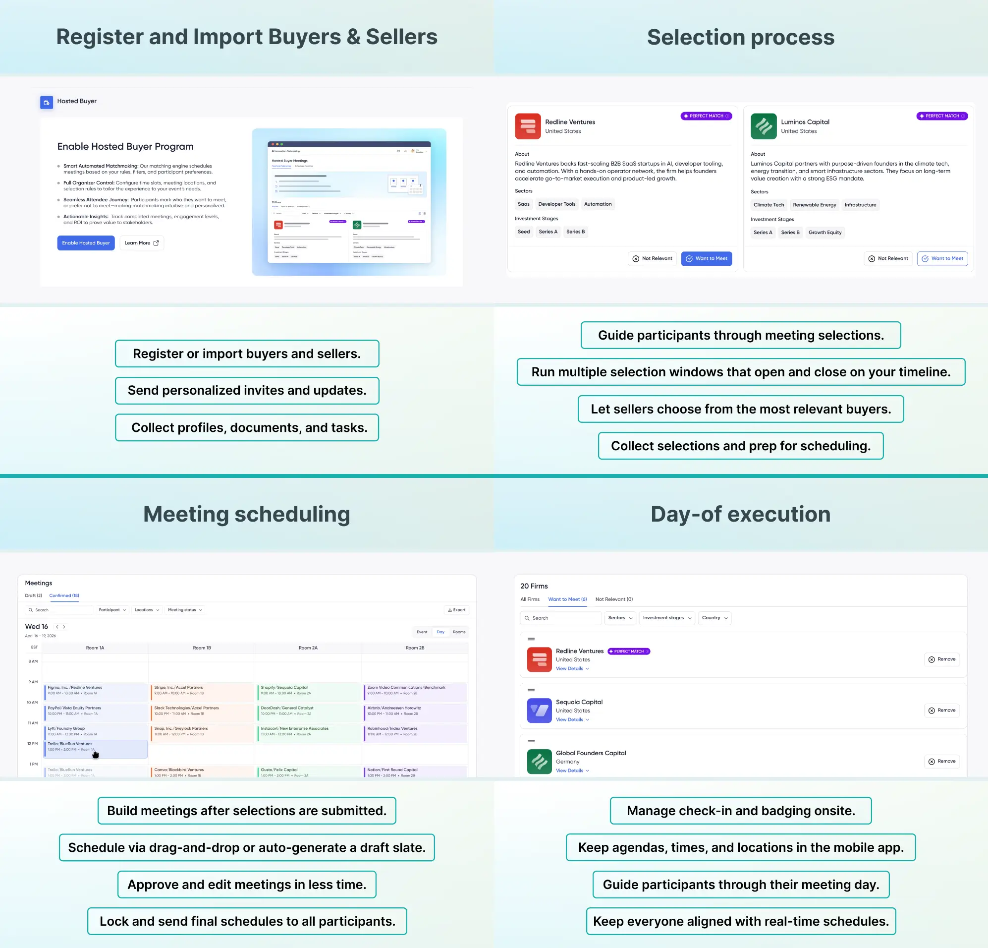 Invite and approve buyers, making sure they agree to a set number of meetings. - Register Sellers