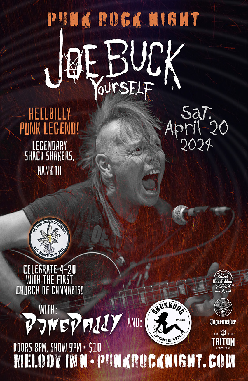 Joe Buck Yourself | Legendary guitarist of Th' Legendary Shack Shakers. As Hank III's villainous sideman onstage, the snarling upright bass player became infamously recognizable. Joe Buck Yourself is now a bona fide evil motherfucking, one man band. This unique blend of hellbilly punk rock ain't your grandma's hillbilly music. Joe Buck yourself, motherfuckers!