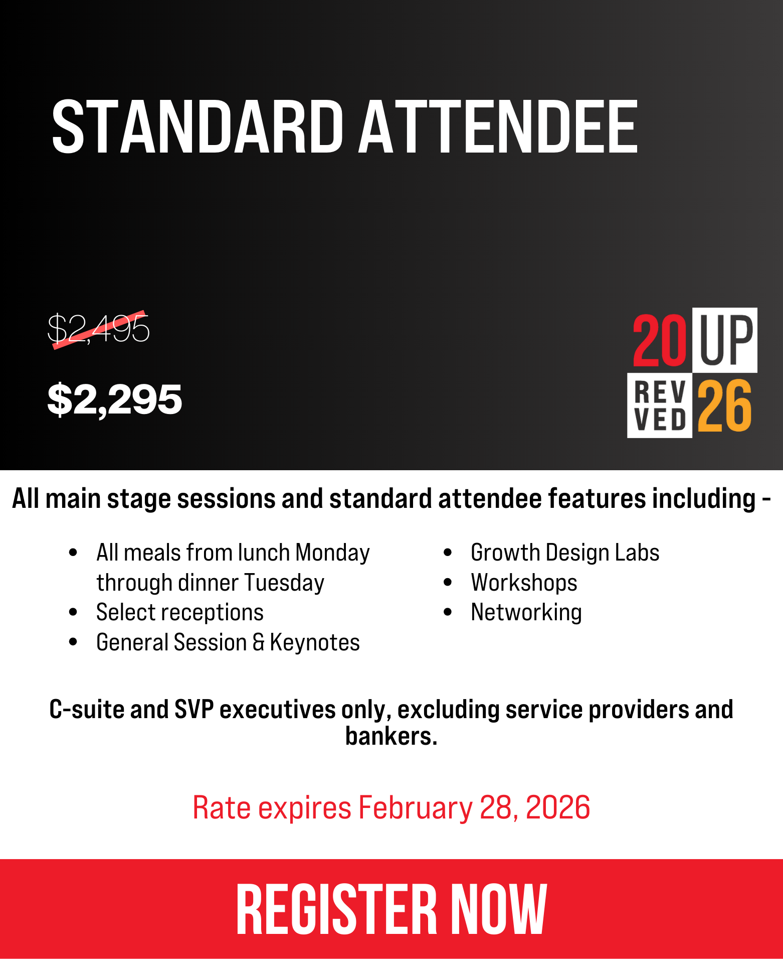 This event is curated exclusively for C-suite and SVP-level executives. All registrations are reviewed by our team, and we reserve the right to cancel and fully refund any registration that does not meet the qualification criteria. Member rates apply only to paid members of Revenue Roomβ’ CXO and the Outsell, Inc. CEO Network; pricing adjustments may be made if membership cannot be confirmed.
